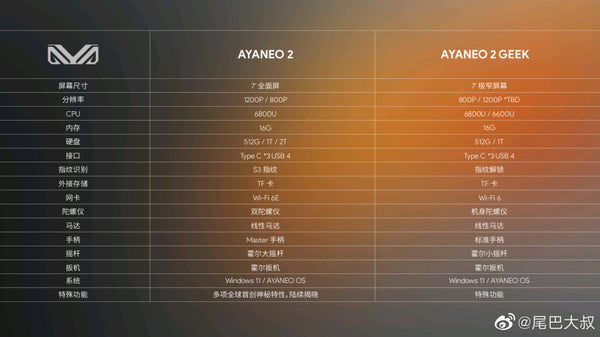 It's as if the brand, faced with product announcements and its own evolutions as and when the designs of current machines, had new ideas and decided to integrate them each time in a different version of its machines. Thus the Aya Neo 2 Geek looks like a "light" version of the Aya Neo 2. Equipped with Ryzen 5 6600U and Ryzen 7 6800U processors, it will be delivered with 16 GB of RAM and 512 GB to 1 TB of storage. The entry ticket will be respectively, 699 and 799$ for the PC console.