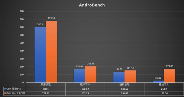For the storage part, AndroBench tested the Dimensity 900 book sequence read 779.33MB/s, sequential write 205.75MB/s, random read 154.42MB/s, random write 173.06MB/s, the overall I/O part compared to Snapdragon The 845 version is slightly stronger.