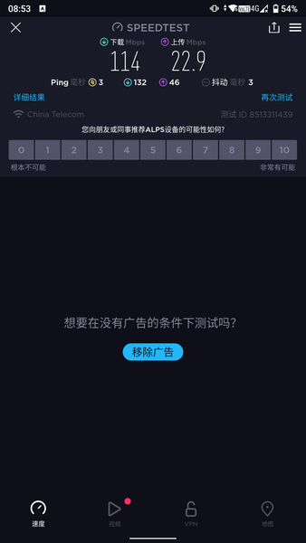 The WiFi part of the Dimensity 900 is a new generation of WiFi6. The actual connection rate of the Redmi AX6 router is 1201Mbps, the downlink rate of the 200M telecom broadband speed measurement is 114Mbps, and the uplink rate is 22.9Mbps.