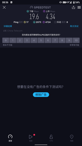 The Speed Test tested the downlink rate of 19.6Mbps and the uplink rate of 4.34Mbps. Although the official claim only supports 4G network, the actual test of telecom 4G can make calls normally, I don't know if it is an unexpected surprise. However, the actual domestic shipment is the Asia/Europe version, and the specific telecom, mobile, and China Unicom support depends on the frequency bands supported by the domestic version.