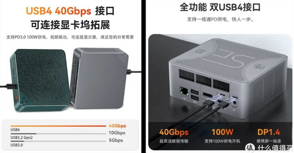 The Beelink SER6 MAX Mini PC offers a comprehensive range of interfaces, making it highly versatile and compatible with various devices. It boasts 2 full-featured USB4 ports, which are a standout feature. These ports support both 100W Power Delivery (PD) charging and 40Gbps transmission speed. This means that not only can you connect multiple peripherals to the Mini PC, but you can also charge compatible devices quickly and efficiently. Additionally, the Mini PC includes USB-C3.2, USB-A3.2 Gen2, and USB2.0 ports, providing flexibility for connecting different types of USB devices.