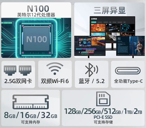 Under the hood, the N100 Pro II Mini PC is powered by a 4-core 4-thread Intel 12th generation N100 processor, capable of reaching a maximum turbo frequency of 3.4GHz. This processing powerhouse ensures smooth multitasking and efficient handling of computational workloads, making it ideal for demanding networking environments.
