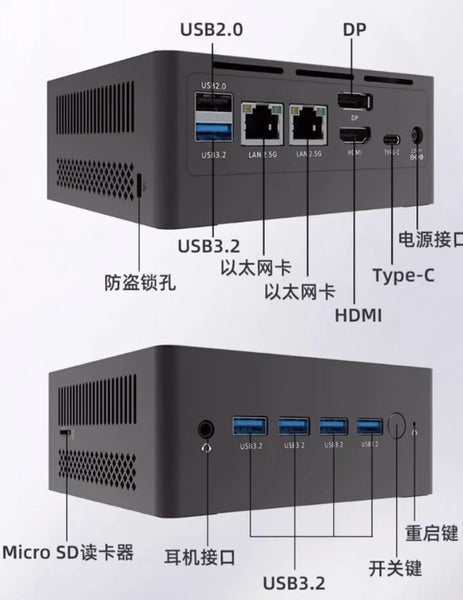 On the side, users will find a convenient microSD card reader, offering expanded storage options for multimedia content and data backup. Meanwhile, the rear panel houses essential interfaces such as 1 USB-A 3.2 port, 1 USB-A 2.0 port, 2 RJ45 interfaces (1 2.5G, 1 1G) for wired networking, and HDMI, DP, and USB-C interfaces, ensuring compatibility with a wide range of display devices and peripherals.