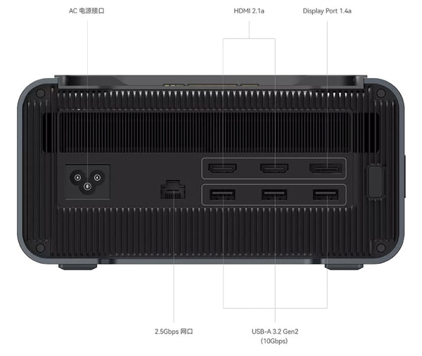 Mind Graphics is not just an external graphics dock; it serves as a comprehensive I/O expansion hub. The front panel includes a 3.5mm headphone jack, a Thunderbolt 4 Type-C port, an SD card reader, and a central RGB indicator light. The back panel is equally impressive, offering a 2.5Gbps wired network port, two HDMI 2.1a interfaces, one DP 1.4a interface, and three USB 3.2 Gen2 10Gbps Type-A ports.