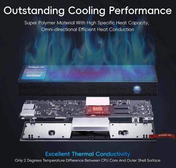 The PCG02 Pro comes with innovative thermal management system. MeLE has incorporated super polymer thermally conductive material, enabling efficient heat dissipation and maintaining optimal operating temperatures. According to MeLE, the temperature difference between the CPU core and the device shell is a mere 2 degrees, ensuring reliable performance under demanding conditions.