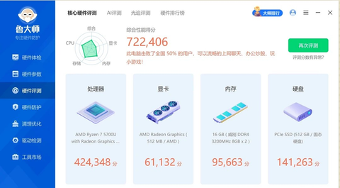 Next, we use Master Lu to run a score and take a look at its core Peroformance. From the running score, the overall score of 72W is indicative of its commendable performance. Notably, the CPU exhibits exceptional prowess, garnering an impressive score of 424,000. The graphics card follows suit with a score of 61,000, while the memory and hard drive contribute significantly with scores of 95,000 and 141,000, respectively. This Mini PC, powered by the venerable Ryzen 7 series CPU, showcases its mettle, delivering outstanding results. When juxtaposed with contemporary Mini PCs featuring Intel's N100 processor, the AM01 stands out as notably more robust, affirming its superior performance capabilities in the realm of compact computing solutions.