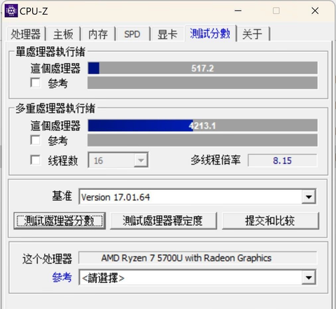 The performance prowess of the Ryzen R7-5700U becomes evident when examining the CPU-Z running scores. Notably, the single-core running score impressively reaches 517.2, showcasing the processor's efficiency in handling individual tasks with finesse. Equally commendable is its multi-core running score, registering an impressive 4213.1. This indicates the processor's exceptional capability to seamlessly manage and execute multiple tasks simultaneously, making it a formidable contender for users seeking a balance of single-core speed and multi-core efficiency in their computing experience.