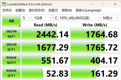 The hard drive is a 512G hard drive that supports the PCIe 3.0 protocol. We ran the benchmark test through CrystalDiskMark. The measured sequential read speed was 2442.14MB/s and the sequential write speed was 1764.68MB/s. Of course, it is comparable to the current PCIe4 with stronger performance. 0 protocol hard drive, the speed is slower, but it is also in line with the level of Pcie3.0 protocol hard drive, and this speed performance is sufficient for daily use.