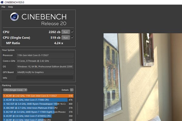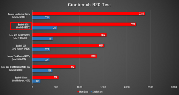 I also ran an earlier Cinebench R20 test on the GTI11 for comparison with richer data sources. It can be seen that the multi-core score of the Beelink GTI 11 is slightly behind the Lenovo IdeaCentre Mini 5i equipped with the i5-10400T six-core and twelve-thread processor, but the single-core score is about 40% higher than the latter.