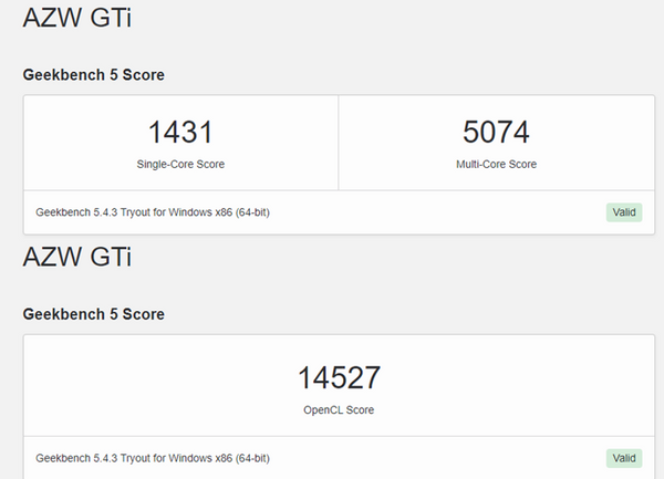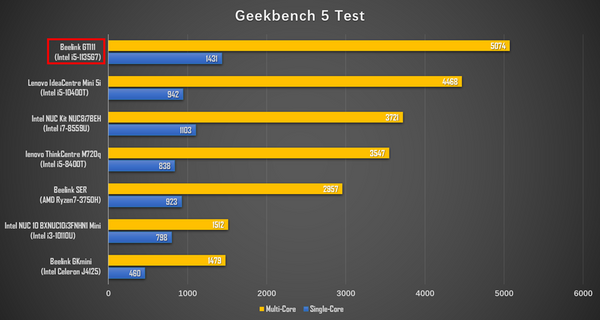 In the cross-platform Geekbench 5 test, the GTI11 scored 1431 for CPU single-core, 5074 for multi-core, and 14527 for OpenCL. Compared with the Lenovo Idea Centre Mini 5i, the single-core score of the Beelink GTI 11 is more than 50% higher, and the multi-core score is also 14% higher.
