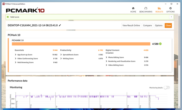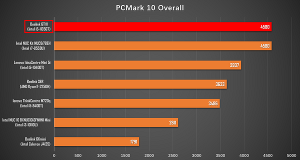 PCMark obtains the complete performance score of the PC by simulating various tasks in modern office scenes and through a series of complex frame rate bonus calculations. The GTI scored 4580 on the PCMark 10 benchmark, tied with the NUC 8 with the Intel i7-8559U and higher than the Lenovo IdeaCentre Mini 5i.