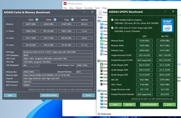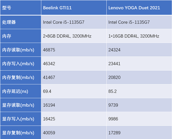 In the memory & cache test of AIDA64, the memory read and write speed of Beelink GTI 11 is almost twice that of the Lenovo YOGA Duet with 16GB single-channel memory, and the latency of 69.4ns is also very low. The performance release of the Iris Xe Graphics integrated graphics card has also been assisted by dual-channel memory. In terms of memory read and write speed, GTI11 is also much higher than YOGA Duet.