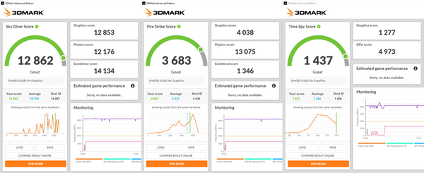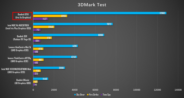 Although Intel Iris Xe Graphics is an integrated graphics card, its performance is very close to the entry-level independent display, and it is much stronger than AMD's Radeon Vega 8 and Vega 10. In 3DMark's Sky Diver, Fire Strike and Time Spy tests, the Beelink GTI 11 scored 12862, 3283 and 1437 respectively.