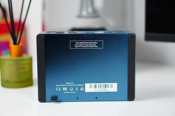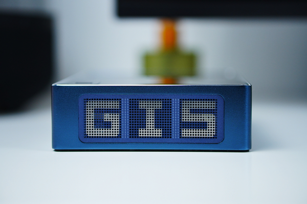 The design of the Beelink GTi 11 is very close to the GTR that went on sale last year. The shell of the fuselage is completely made of magnesium-aluminum alloy and uses a matte blue spray paint, which can effectively prevent fingerprints while ensuring durability. The top is covered with a layer of tempered glass, which adds to the stylish look of the product. The body of GTI11 is very compact, with a width of 160mm, a depth of 120mm, and a height of only 39mm, which does not occupy too much desktop space. You can also choose to install it on the back of the monitor through the standard bracket, so that the monitor can be turned into an all-in-one machine in seconds.