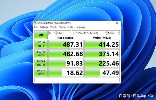 Mini S is pre-installed with M.2 2280 solid state drive of SATA3 specification. The measured sequential read and sequential write speeds in CrystalDiskMark are 487 mb/s and 414 mb/s respectively, which can only be said to be quite satisfactory, compared to PCle 3.0 /4.0 solid state drive gap is obvious. However, the measured startup of the Windows 11 system can still be controlled within 10s, and the speed of installing and opening large-scale software is still relatively fast, and it will not become a performance shortcoming of the entire system.