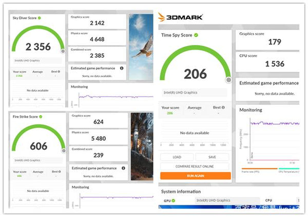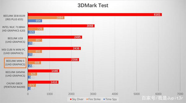 Intel UHD Graphics has limited support for games, and Mini S only supports single-channel memory, which will theoretically affect the performance of the core display. However, in the three tests of 3DMark's Sky Diver, Fire Strike, and Time Spy, the score of the Mini S is not much worse than the U59 with dual-channel memory.