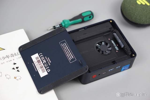 After unscrewing the four screws on the bottom panel, a one-piece aluminum alloy cooling bracket comes into view. In addition to installing an additional 2.5-inch hard drive, the bracket is also equipped with a 4007 OS small fan, which is dedicated to cooling the two hard drives and ensuring the stability of data read and write speeds. Below the bracket are the slots for DDR4-3200 memory sticks, M.2 2280 PCIe4.0x4 solid-state drives, and M.2 2230 wireless network cards, but removing the bracket requires a relatively long screwdriver.