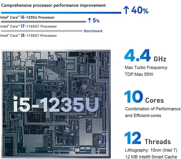 SEi12 is equipped with an Intel Alder Lake Core i5-1235U processor with a TDP of 15W, a base frequency of 3.30GHz, and a turbo frequency up to 4.4GHz. It uses a 10-core CPU architecture (2 performance cores and 8 energy efficiency cores ), 12 threads, 12MB smart cache, compared with the previous generation of Tiger Lake series mobile processors, it has been greatly improved. In terms of graphics, the i5-1235U integrates an Intel Iris Xe core graphics card with 80 execution units, and its dynamic frequency can reach up to 1.2GHz, and its performance is basically the same as that of the previous generation Core processor.