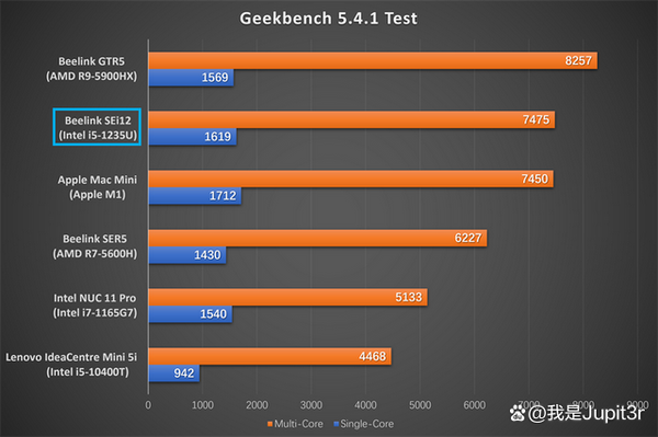 Geekbench 5 is currently the most reliable cross-platform performance testing software. It measures the CPU single-core and multi-core performance of a computer by simulating single-task and multi-task processing scenarios in the background. The final CPU single-core score of SEi12 is 1619, and the multi-core score is 7475, both surpassing the SER5 Pro equipped with AMD Ryzen 5-5600H. The multi-core score also has an advantage over Mac mini. Compared with NUC 11 Pro, it is even easier to hang.