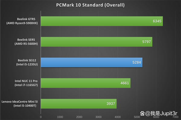 Compared with Master Lu, the results of PCMark 10 developed by the professional benchmarking company UL are actually more valuable. Its principle is to simulate multiple workflows including video conferencing, content creation, web browsing, and document processing in the foreground. The average frame rate of these workflows is combined to arrive at the computer's performance score. Generally, a computer with a score above 4000 is considered to have excellent performance. The score of SEi12 is 5284, 13% higher than the i7 version of NUC 11 Pro, but 9% lower than SER5 Pro.