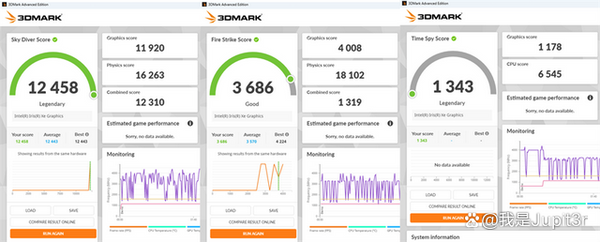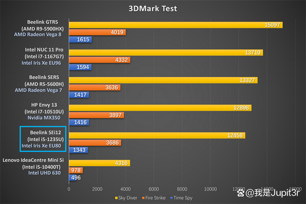 3DMark is currently the most professional game performance testing software. As always, I chose three subtests: Time Spy, Fire Strike, and Sky Diver. Among them, Time Spy examines the performance of computers running DirectX 12 games, while Fire Strike and Sky Diver are both based on DirectX 11, but the former is mainly used to test game consoles, while the latter is mainly used to test thin and light notebooks and ordinary home computers. The scores of SEi12 in these three tests are 1343, 3686 and 12443 respectively, which are lower than the i7-1165G7 version NUC. Although the latter is also an Intel Iris Xe core display, the number of execution units is 20% higher than that of SEi12. This also shows that although the 12th-generation mobile Core processor has greatly improved CPU performance, GPU performance is actually stagnant.