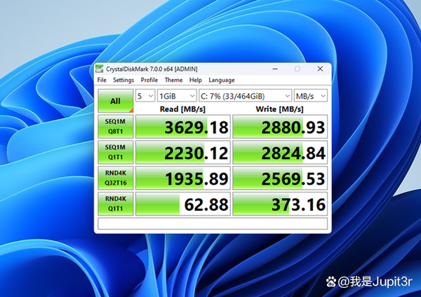 The standard M.2 solid-state drive interface and 500GB Kingston SSD of SEi12 are both PCIe4.0x4 specifications. According to the test results of CrystalDiskMark, the sequential reading speed exceeds 3500mb/s, and the sequential writing speed is also close to 3000mb/s. It is very fast when starting the system, large-scale applications and games. If this speed still doesn’t satisfy you, you can also buy a barebone version, insert a 7000mb/s read speed SSD yourself, and the dedicated 4007 OS cooling fan and aluminum plate can effectively prevent the hard drive from overheating.