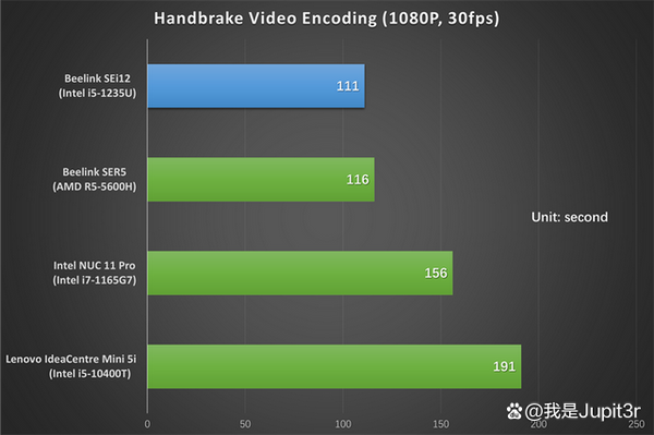 To convert a 3-minute 1080P/30fps video in Handbrake, SEi12 takes 1 minute and 51 seconds, which is faster than Beelink SER5 Pro, Intel NUC 11 Pro and Lenovo IdeaCentre Mini 5i.