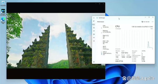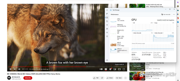 Although the Intel core display is slightly inferior to the AMD core display of the same generation in terms of game performance, it has a great advantage in video playback. From the results read by DXVA Checker, SEi12's Iris Xe EU80 core display can support hard decoding of almost all mainstream video formats to 4K or 8K. When playing an 8K video encoded by VP9, the CPU usage rate is only 1%-2%, and the GPU usage rate is also within 50%.