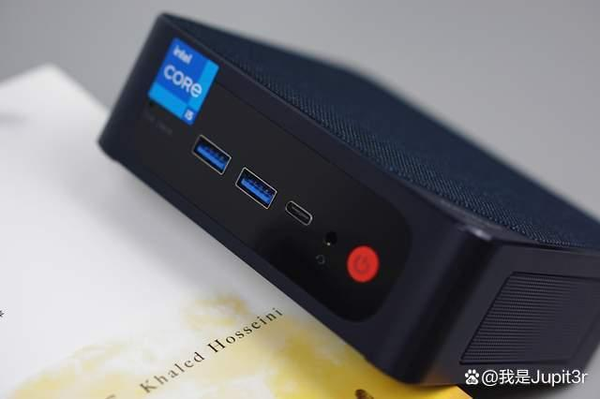 On the front panel of the fuselage, there is a red power button, a CMOS clear jack, two USB-A ports, a Type-C port, and a 3.5mm audio port. The specifications of USB-A and C interfaces are both USB3.2 Gen1, which supports 5Gbps data transmission bandwidth, which is inferior to the common USB3.2 Gen2 (10Gbps) on some other high-end Mini PCs, and is comparable to the Thunderbolt 3 of NUC 11 Pro. The interface is even more incomparable.