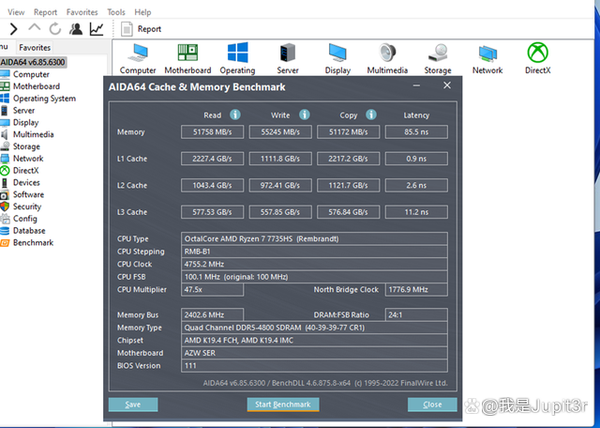 The memory used by SER6 Pro s Crucial DDR5-4800MHz. In the AIDA64 memory performance test, the read, write, and copy speeds all exceed 50,000MB/s, which is more than 40% performance improvement compared with DDR4-3200MHz.
