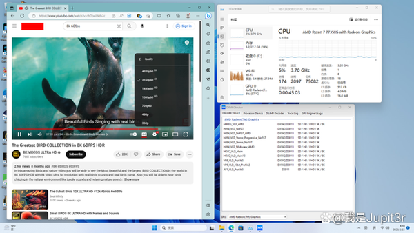 Online playback of 4K 60fps and 8K 30fps web videos is also very smooth, and the hardware resource usage is very low. However, because it does not support AV1 decoding, SER6 Pro will get stuck with a slideshow effect when playing 8K 60fps web videos. In contrast, I reviewed the low-power Mini PCs of Alder Lake N95 and N100 a few days ago, which can smoothly play 8K 60fps web video. So, if you mainly want an HTPC, the SER6 Pro is not suitable for both price and performance.