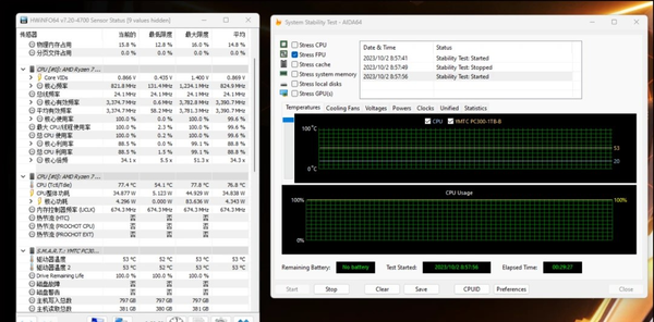 In high-performance mode, running the AIDA64 FPU baking test, the processor can initially achieve a power consumption release of 65W, but it will soon fall back and stabilize to about 48W, and it will still stabilize in a straight line after 30 minutes. At this time, the CPU temperature 84 degrees, the main frequency is about 3.8GHz, the noise value next to the host is about 52 decibels, the power consumption of the whole machine is about 73W, and the maximum temperature of the top cover is about 41 degrees.
