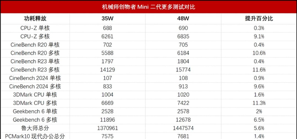 The answer is, very little. Through comparison, it can be seen that between the two power modes of Creator Mini 2, the CPU single-core performance gap is less than 2%, and the multi-core performance is improved by 6% to 11%. In comprehensive testing software such as Master Lu, PCMark and CrossMark, The difference is also very small.