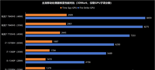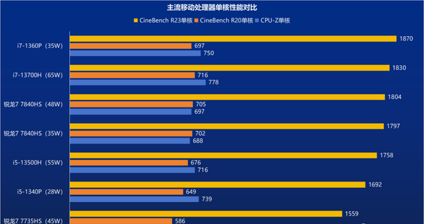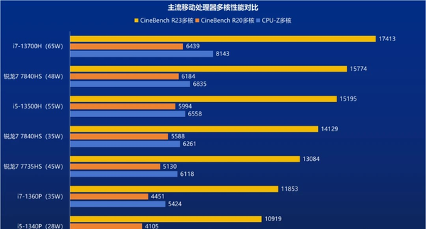 In terms of multi-core performance, the 35W 7840H is slightly inferior to the i5-13500H, but it can surpass it with 48W power consumption.
