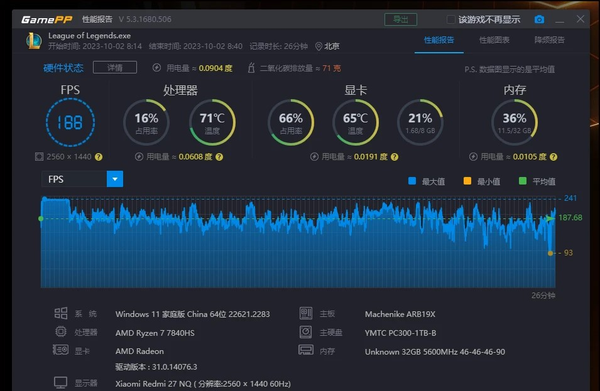In the game test session, in "League of Legends", with 2K resolution and the highest image quality, after a 26-minute game, the average frame rate of Creator Mini 2 can reach 188FPS, the highest frame rate is 241FPS, and the lowest frame rate is 93FPS. Very smooth.