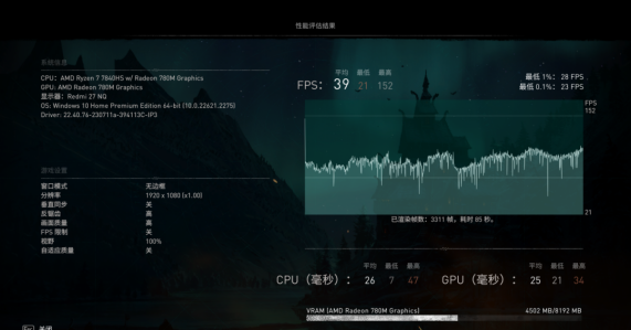 The average frame rate of "Assassin's Creed Valhalla" in high image quality is 39FPS, which can be increased to 62FPS when adjusted to low image quality.