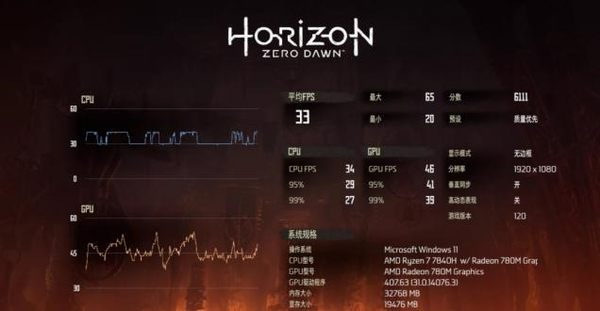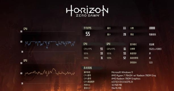 The average frame rate of "Horizon Zero Dawn" is 33FPS when quality is prioritized, and can be increased to 55FPS when performance is adjusted.