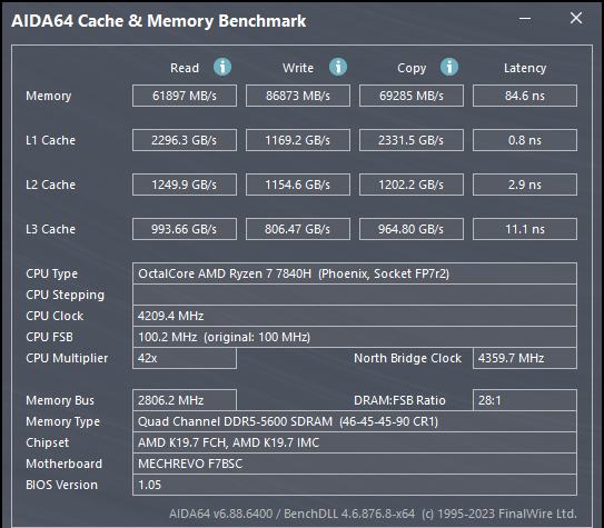 The tested Mechrevo S is equipped with two 16GB DDR5-5600 memory modules sourced from Yingruida, configured in a dual-channel mode. Through testing, the memory demonstrated impressive performance metrics, boasting read, write, and copy speeds of 61.8GB/s, 86.8GB/s, and 69.2GB/s respectively. Moreover, the memory showcased a relatively low latency of 84.5 ns, further enhancing its overall efficiency and responsiveness.