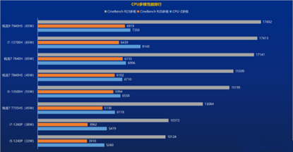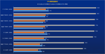 When it comes to CPU multi-core performance, the Ryzen 7 7840H holds its ground impressively. It may fall slightly short of the i7-13700H, but it maintains a significant lead over the i5-13500H. The real strength of the Ryzen 7 7840H lies in its eight Zen4 large cores, a clear advantage that continues to shine. These cores enable the processor to handle multi-threaded tasks with finesse, making it a formidable choice for users who demand robust performance from their computing devices.