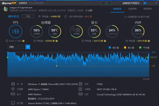 In the game test session, in "League of Legends", with 2K resolution and the highest image quality, after a game of nearly 29 minutes, the average frame number of New Unbound S can reach 193FPS, the highest frame number is 242FPS, and the lowest frame number is 107FPS, which is extremely smooth. .