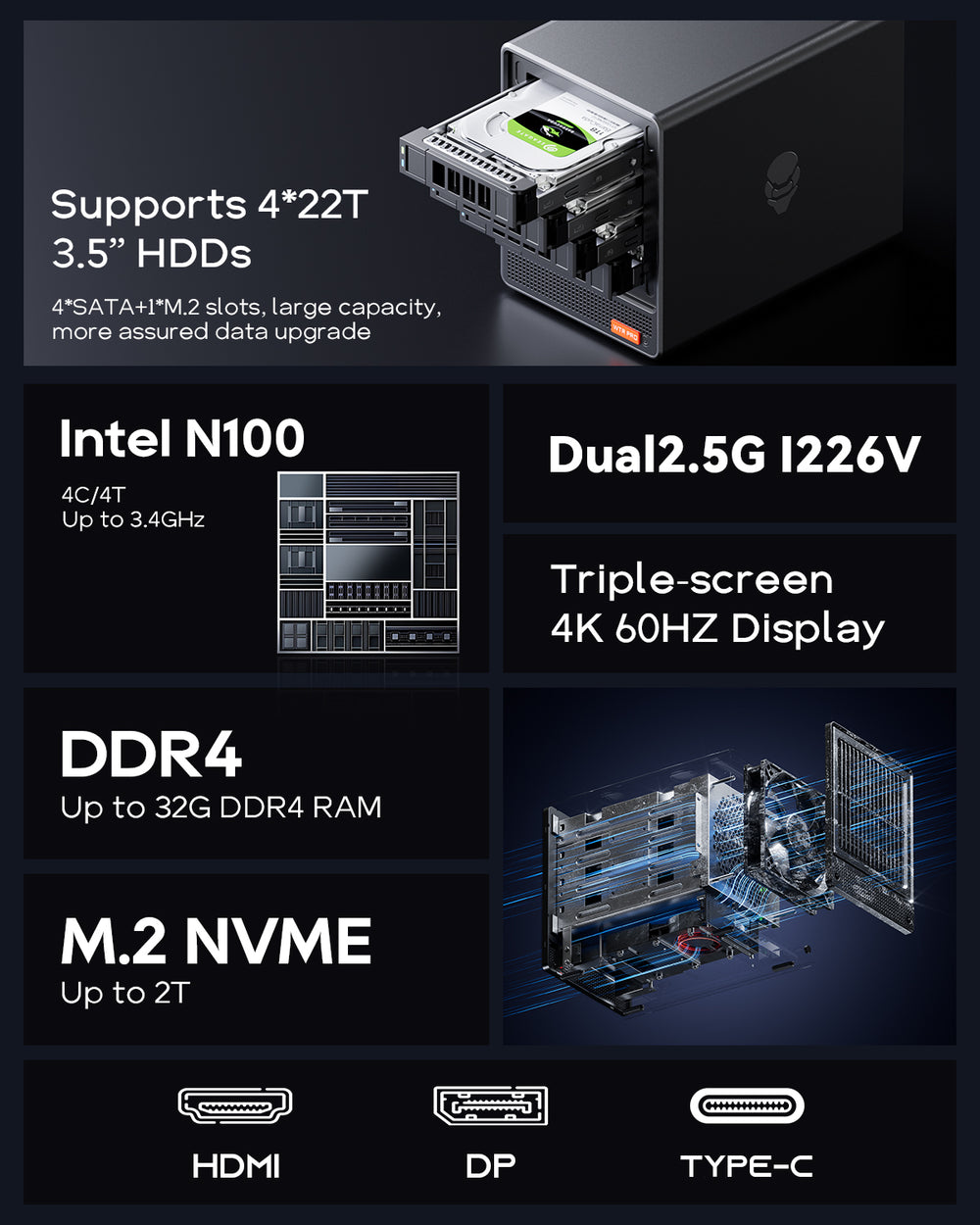 AOOSTAR WTR Pro Mini PC NAS Intel N100 Quad-Core 4 Hot Swap HDD Bays Dual 2.5G Ethernet Ports Barebone (No Ram & SSD)