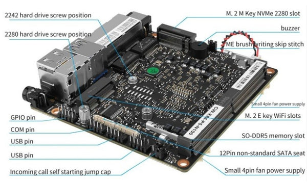 Darüber hinaus bietet der Mini-PC Erweiterungsmöglichkeiten mit einem M.2-2230-Anschluss für eine optionale WLAN-Karte. Das Mainboard verfügt über einen nicht standardmäßigen 12-Pin-Anschluss, der den Einbau einer 2,5-Zoll-Festplatte oder SSD ermöglicht. Ob dies in einem kompakten, lüfterlosen Design sinnvoll ist, ist allerdings fraglich.