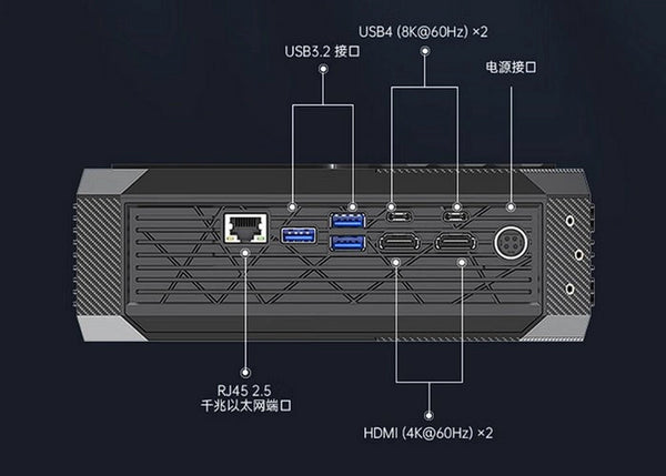 Der HX77G bietet zahlreiche Anschlussmöglichkeiten. Er verfügt über zwei USB4-Anschlüsse und zwei HDMI 2.1-Displayausgänge, die die gleichzeitige Anzeige auf bis zu vier Bildschirmen ermöglichen und eine hochauflösende 8K-Ausgabe unterstützen. Egal ob Gaming, Streaming oder Multitasking – dieser Mini-PC ist für Sie da.