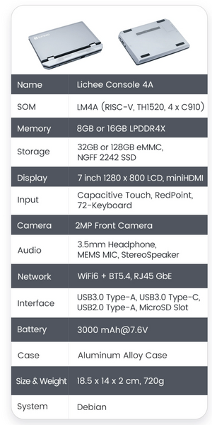 Der Mini-Laptop verfügt über ein 7-Zoll-kapazitives Touch-Display mit einer Auflösung von 1280 x 800 Pixeln, ergänzt durch eine 72-Tasten-Tastatur mit einem „RedPoint“-Stick in der Mitte, der an Lenovos „TrackPoint“ erinnert. Die Lichee Console 4A ist in einem Aluminiumgehäuse untergebracht und bietet zahlreiche Anschlüsse, darunter USB 3.0 Typ-C, USB 3.0 Typ-A, USB 2.0 Typ-A, Mini-HDMI, einen microSD-Kartenleser und eine 3,5-mm-Audiobuchse. Zusätzlich unterstützt sie WiFi 6 und Bluetooth 5 und wird von einem 3.000 mAh/7,6 V Akku mit Strom versorgt.