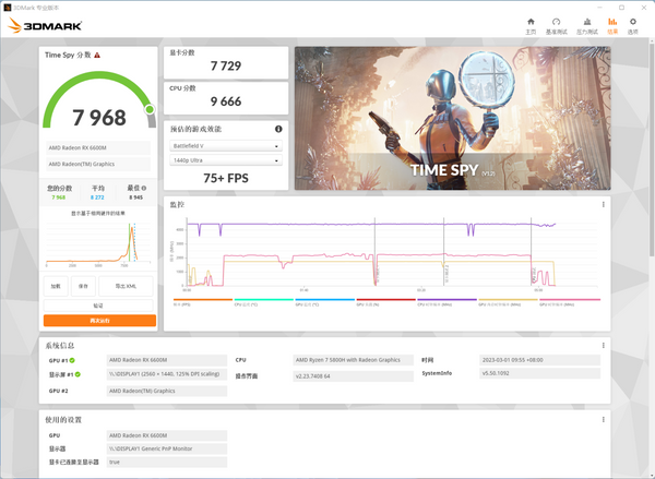 In Bezug auf die Laufpunkte erreichte der theoretische GPU-Score von 3DMark TimeSpy der RX 6600M-Grafikkarte 7729 Punkte, was in etwa einer 100-W-Laptop-GPU RTX 3060 entspricht. Für Mainstream-Spiele ist das mehr als ausreichend.