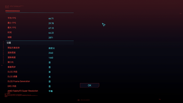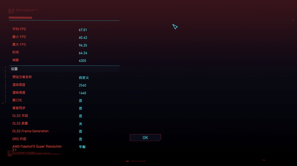 Werfen wir zum Schluss noch einen Blick auf das anspruchsvollste „Cyberpunk 2077“. Beim Ausführen des Benchmarks in 2K-HD-Qualität können durchschnittlich 67 Frames erreicht werden, was für ein flüssiges Spielerlebnis sorgt.