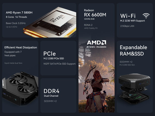 Der Ryzen™ 7 5800H ist mit AMDs Vorgängermodell Vega 8 512sp ausgestattet, das im Vergleich zum aktuellen Mainstream-Modell 6800H relativ schwach ist. Glücklicherweise verfügt der HX80G jedoch über ein leistungsstärkeres, unabhängiges Display: die RX 6600M. Die RX 6600M ist AMDs neueste mobile GPU. Sie nutzt hocheffiziente 7-nm-Technologie, kombiniert mit RDNA 2-Architektur, mit 8 GB GDDR6-Speicher, 1792 Stream-Prozessoren und 32 MB unbegrenztem Cache. Die Leistung ist nicht zu unterschätzen. Darüber hinaus kann sie mit AMDs Prozessor und Chipsatz zusammenarbeiten, um zwischengespeicherte Daten schnell zu lesen, was insbesondere in Spielen von Vorteil ist.