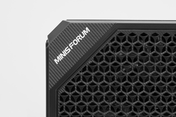 Das Gehäuse des MINISFORUM HX80G besticht durch sein robustes Design im Panzerstil mit scharfen Kanten und Ecken und einem ausgeprägten Industrie-Charakter. Neben dem Logo befinden sich an den Ecken Kohlefaserstrukturen als Verzierung.