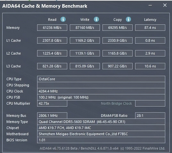 Bei unseren Tests mit AIDA 64 stieg die Lesegeschwindigkeit auf beeindruckende 61.236 MB/s, während die Schreibgeschwindigkeit bemerkenswerte 87.160 MB/s erreichte. Auch die Kopiergeschwindigkeit, ein entscheidender Faktor für die Speicherleistung, erreichte beeindruckende 69.295 MB/s. Die Verzögerung betrug lediglich 87,4 ns, was die außergewöhnliche Reaktionsfähigkeit dieses Speichers unterstreicht. Diese außergewöhnlichen Werte machen ihn eindeutig zum Spitzenreiter der Speichertechnologie.