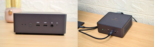 Eines der herausragenden Merkmale des UM790 Pro ist seine durchdachte Schnittstellenanordnung. Minisforum hat die Anschlüsse sowohl an der Vorder- als auch an der Rückseite des Mini-PCs strategisch platziert. An der Vorderseite befinden sich eine Reset-Öffnung, eine Statusanzeige, ein Netzschalter, zwei USB4-Anschlüsse und eine 2-in-1-Audio-Mikrofon-Schnittstelle. Ein besonderes Highlight sind die zwei vielseitigen USB4-Anschlüsse an der Vorderseite. Diese Anschlüsse bieten eine beeindruckende Übertragungsgeschwindigkeit von 40 Gbit/s, unterstützen Videoausgabe und eine bemerkenswerte PD-Stromversorgungskapazität von 100 W. Diese USB4-Schnittstelle kann sogar an ein externes Grafikkartendock angeschlossen werden, ähnlich wie eine Thunderbolt-3-Schnittstelle, und bietet so vielfältige Möglichkeiten für kreative Anwendungen und erweiterte Funktionalität.